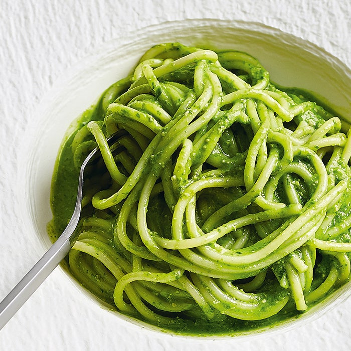 100 g gewaschenen Bärlauch in grobe Stücke schneiden. Mit 20 g gehackten Pinienkernen und 20 g geriebenen Parmesan in einem Mörser zerkleinern und 200 ml Olivenöl nach und nach eingießen, bis eine homogene Masse entsteht. Mit Salz und Pfeffer abschmecken. Fertig!