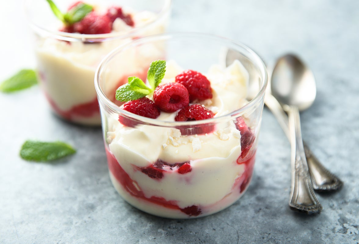 - Abwechselnd Obers-Topfen-Creme, gefrorene Himbeeren und Baiser in Gläser schichten