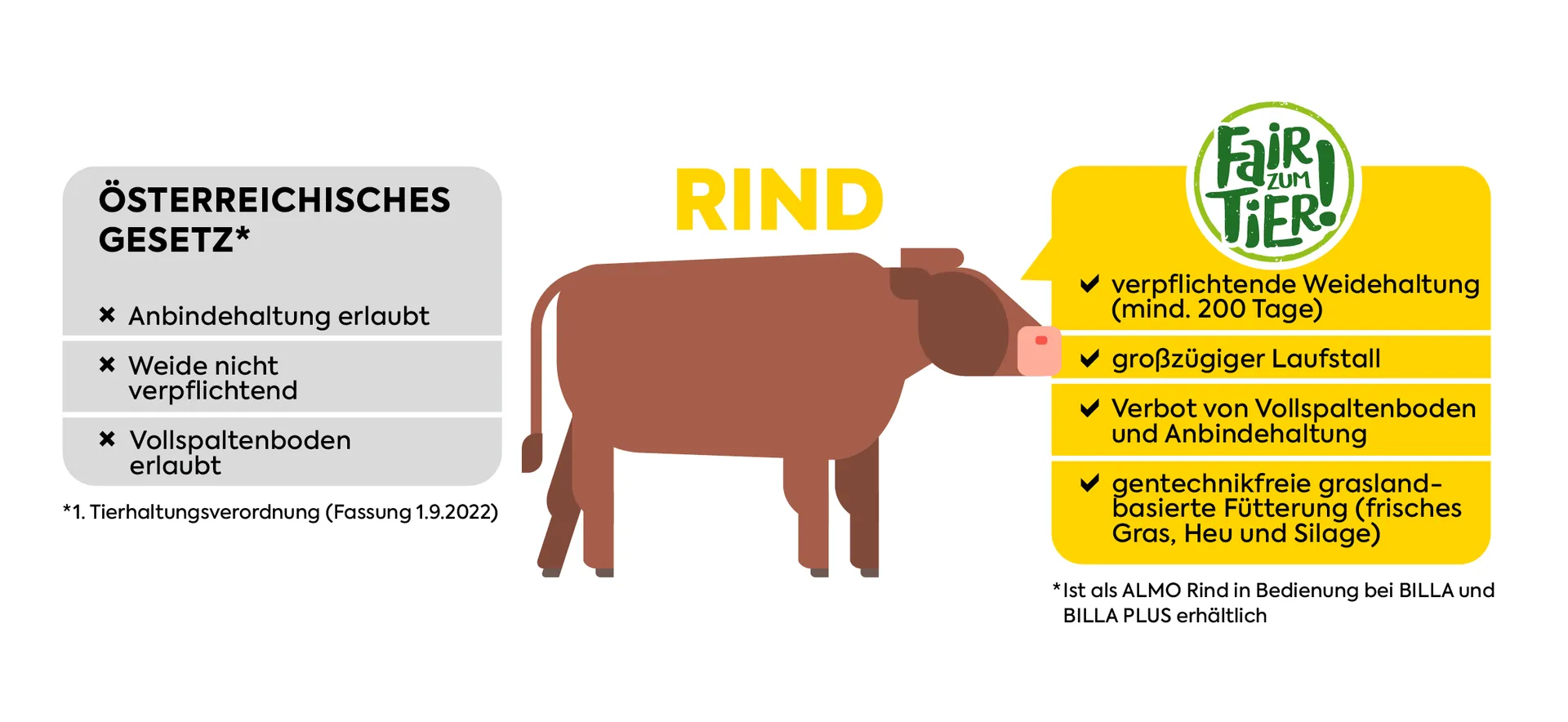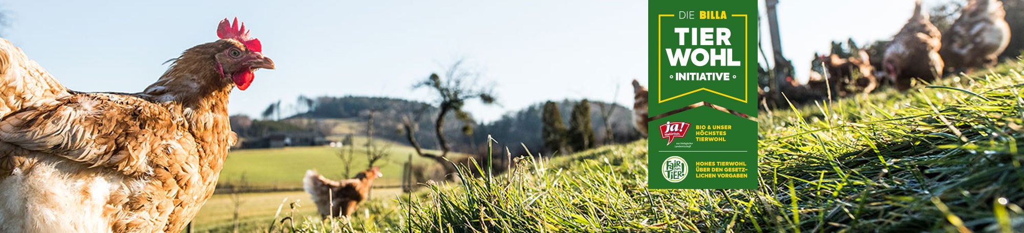 In Österreich gelten hohe Tierwohl-Standards, die uns von BILLA nicht hoch genug sind. Mehr Tierwohl als das Gesetz verlangt mit „Fair zum Tier!“ und unser höchstes Tierwohl mit Ja! Natürlich. Und das alles selbstverständlich zu 100 % aus Österreich. Das heißt zum Beispiel: