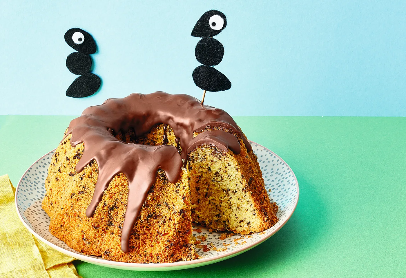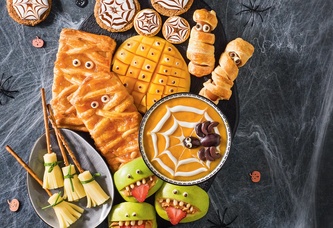 Halbiere die Oliven und schneide 8 Hälften in Scheiben. Schlage das Schlagobers mit einem Schneebesen etwas auf. Fülle die Kürbissuppe in 8 kleine Schalen. Setze mit einem Löffel jeweils einen Klecks Schlagobers in die Mitte und 2 Kreise rundherum. Ziehe es mit einem Zahnstocher mehrmals von der Mitte nach außen, sodass ein Netz entsteht. Setze die Olivenhälften und -scheiben zu kleinen Spinnen darauf. Setze jeweils 2 Schoko-Augen auf die Spinnen.