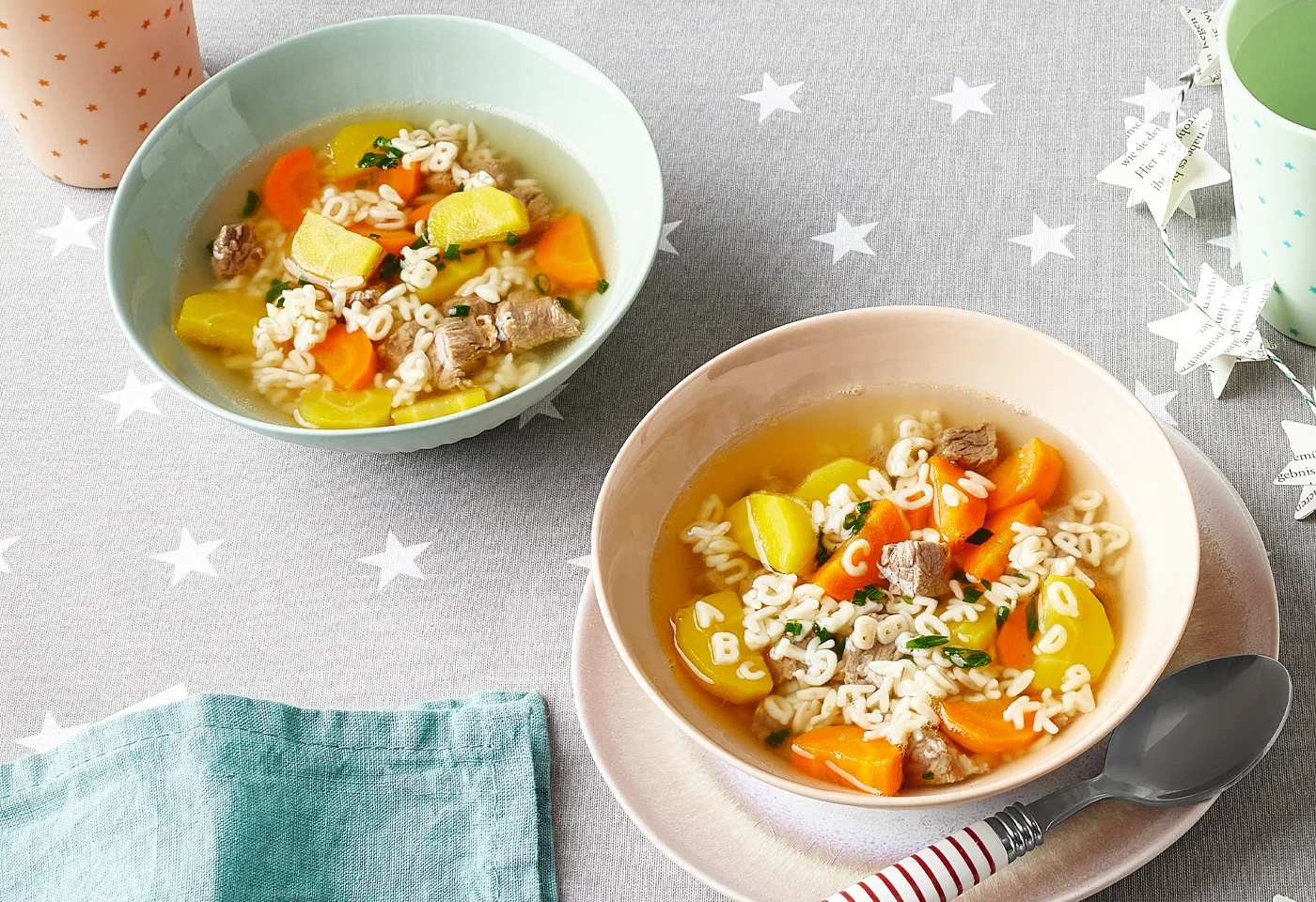 Ist das Gemüse weich, bitte jemand Erwachsenen um Hilfe. Püriere die Suppe mit einem Stabmixer fein. Schmecke sie mit Salz ab und stelle sie auf niedriger Hitzestufe bzw. kleiner Flamme warm.