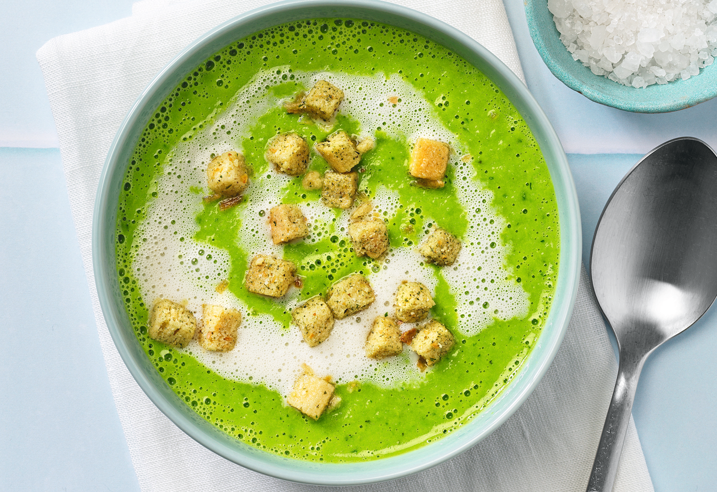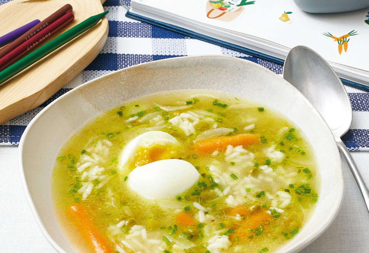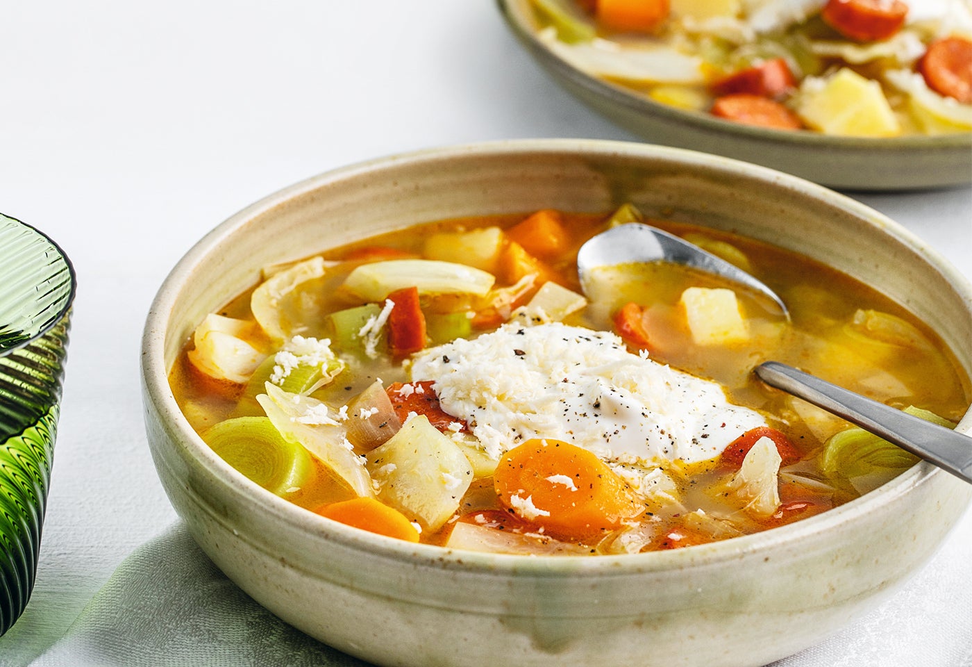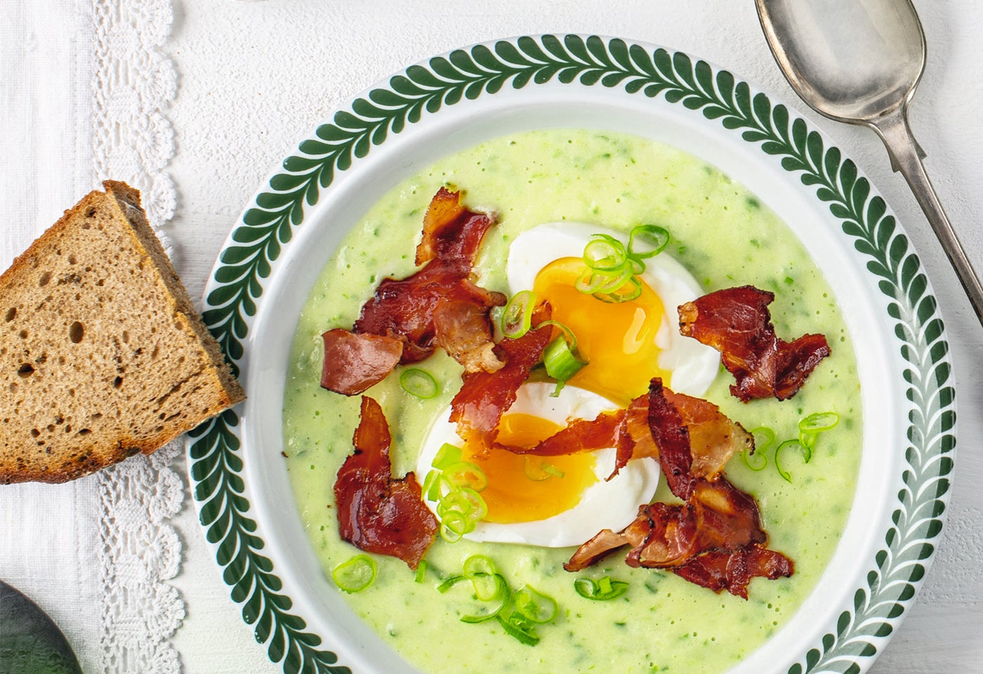 Jungzwiebel-Häuptelsalat-Suppe mit Ei und Speck