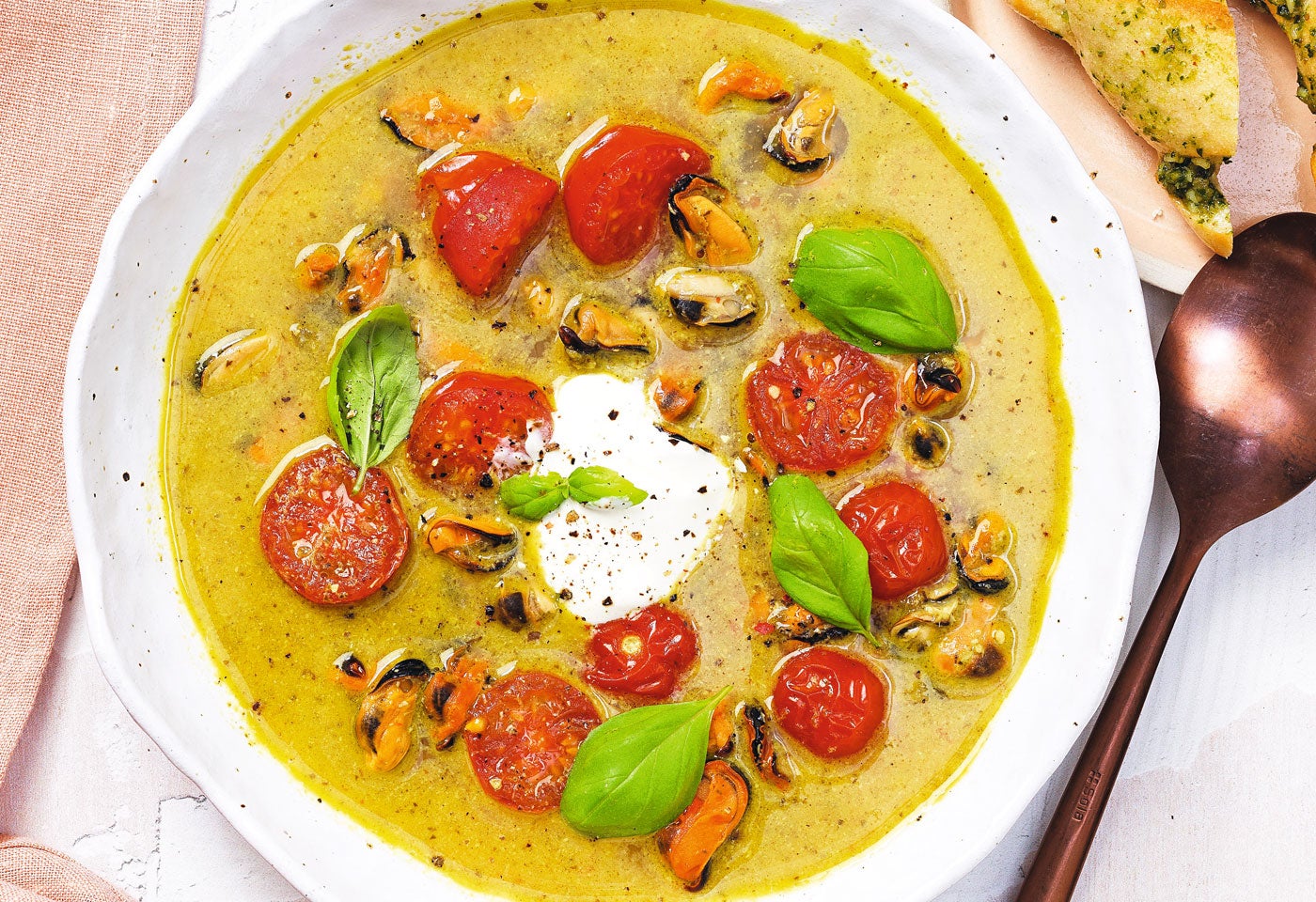 Muschelsuppe mit Basilikum und Cherrytomaten