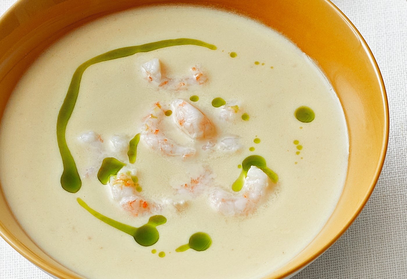 Karfiolcremesuppe mit Garnelen und Kräuteröl