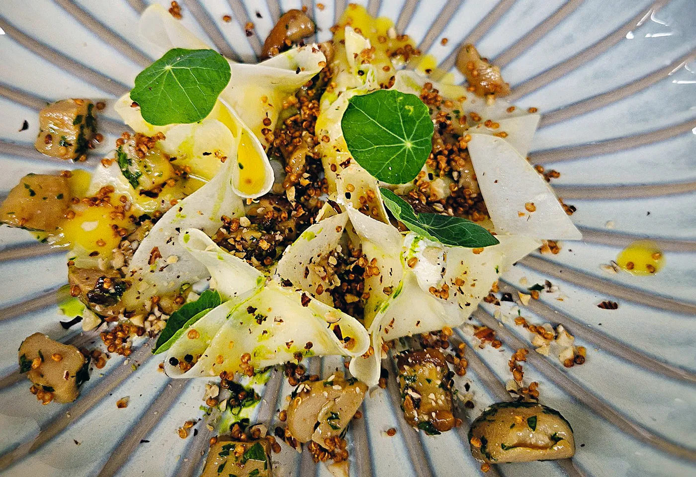 Pulled-Räuchersaibling-Brote mit Weißweinkürbis und Grammeln