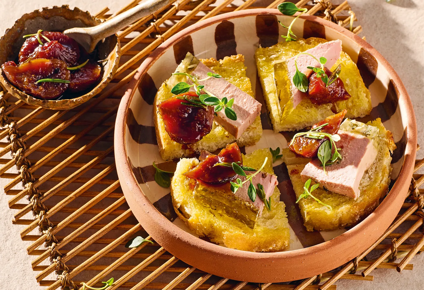 Pastetentrio auf Knusperweißbrot mit Rotweinfeigen
