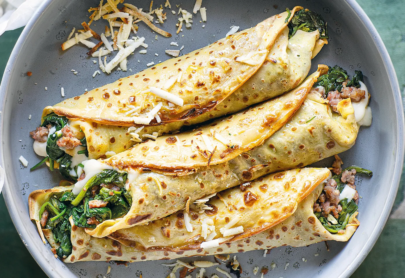 Palatschinken mit Spinat, Salsiccia und Käse