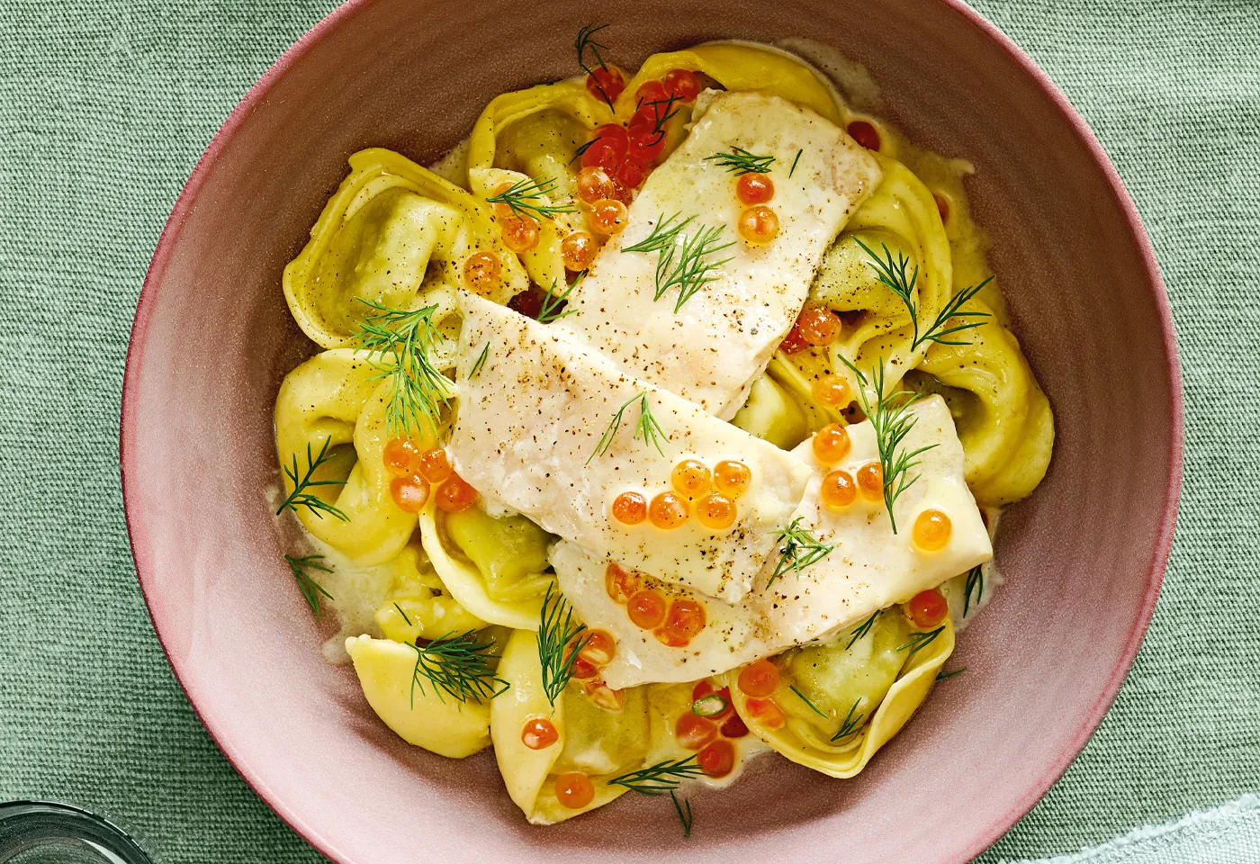 Ricotta-Spinat-Tortelloni mit Forellenfilet und -kaviar