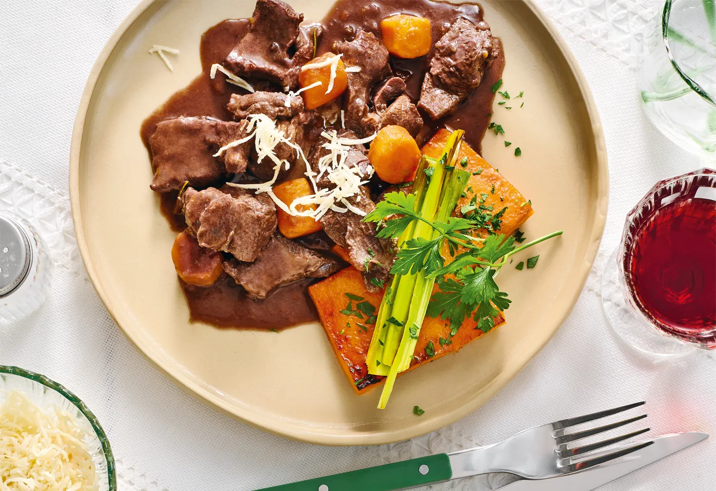 Rehragout mit Ofenkürbis und Honiglauch