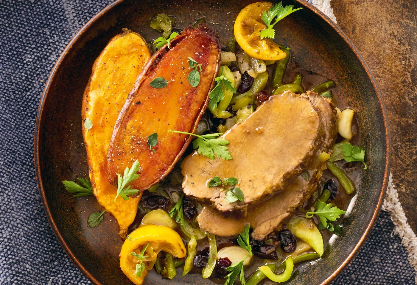Rindsschulterbraten mit Cranberry-Paprika-Gemüse und Süßkartoffeln