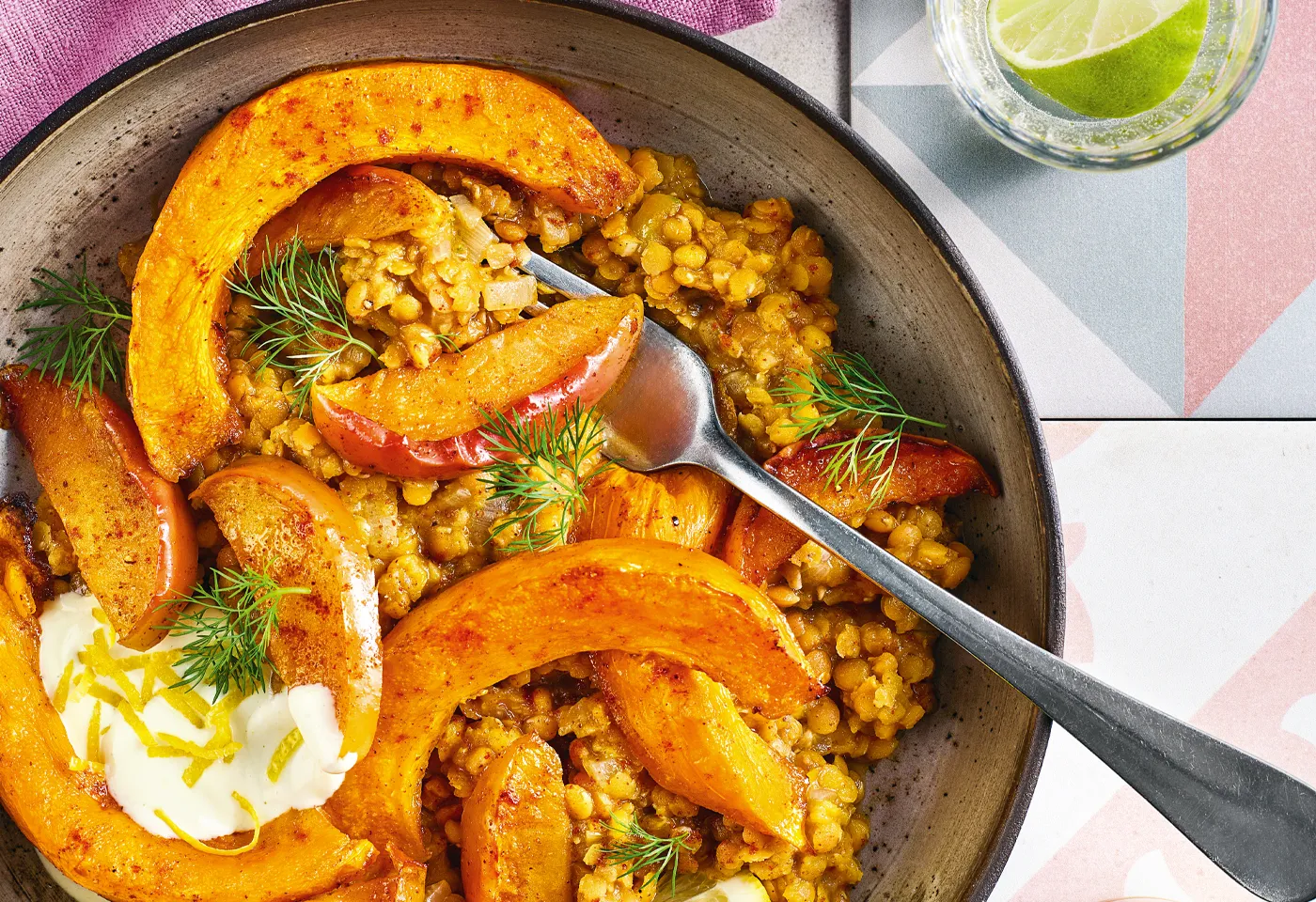 Rauchige Harissa-Linsen mit Kürbis, Apfel und Zitronen-Seidentofu