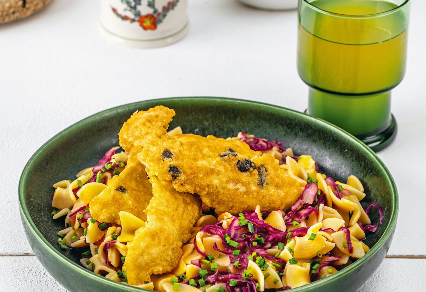 Steirische Hendl-Piccata mit Kürbis-Rotkrautfleckerl
