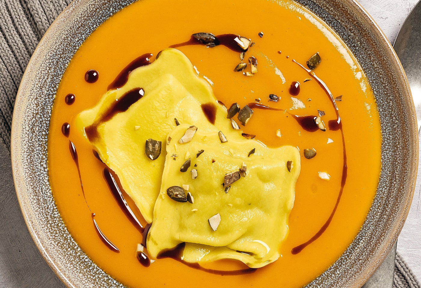 Kürbiscremesuppe mit Spinat-Ricotta-Ravioli