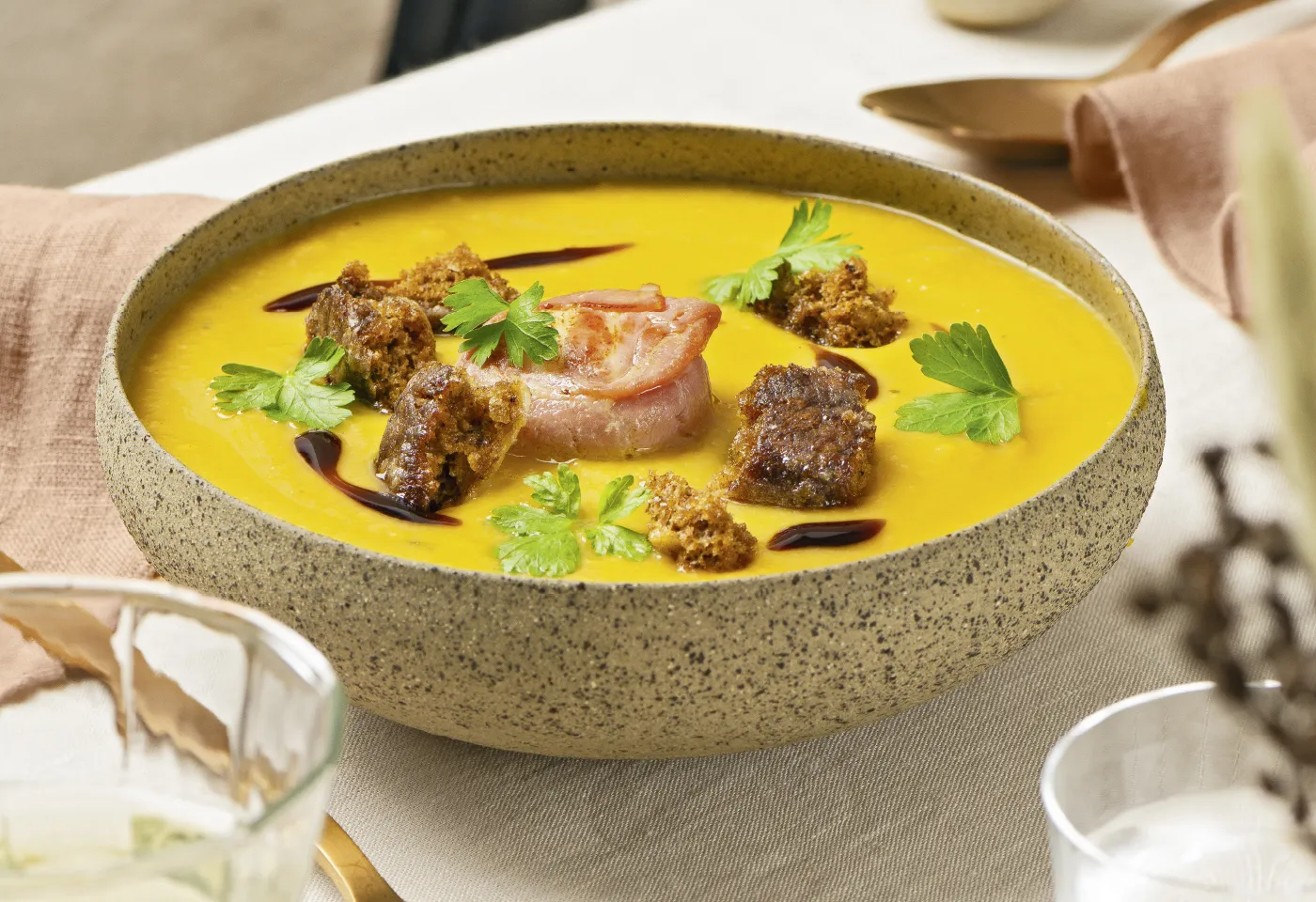 Süßkartoffelsuppe mit Speck-Ziegenkäsetalern und Lebkuchen-Croûtons