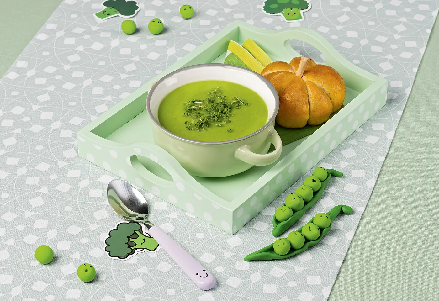 Erbsen-Brokkoli-Suppe mit Kürbis-Weckerln