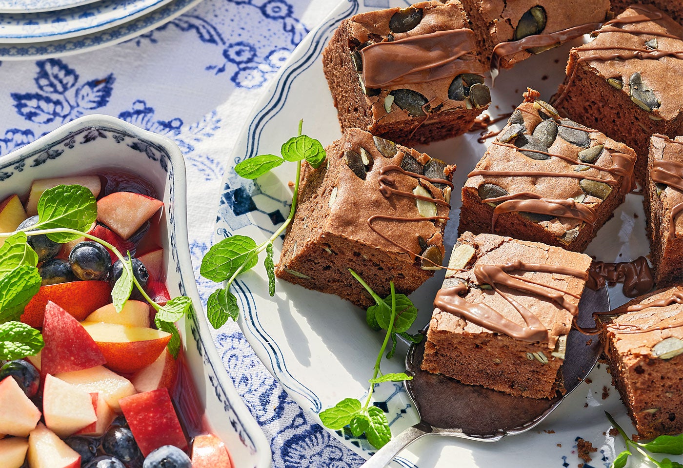 Süß-salzige Kürbiskern-Brownies mit Sangria-Obstsalat