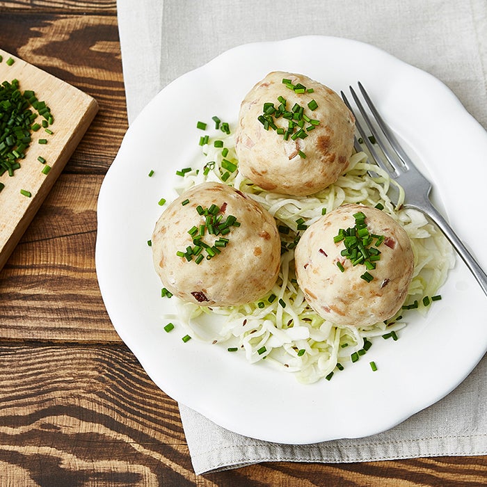 Gekochte Knödel am besten noch gefroren in siedendes Salzwasser geben, bis sie oben schwimmen. So werden sie gleichmäßig warm.