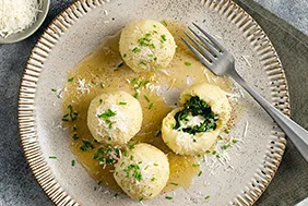 Zum Auftauen der rohen Knödel, diese in kaltes Wasser legen und auf Zimmertemperatur bringen. Dann langsam erhitzen, bis die Knödel an der Oberfläche schwimmen und so 15-25 Minuten sieden.