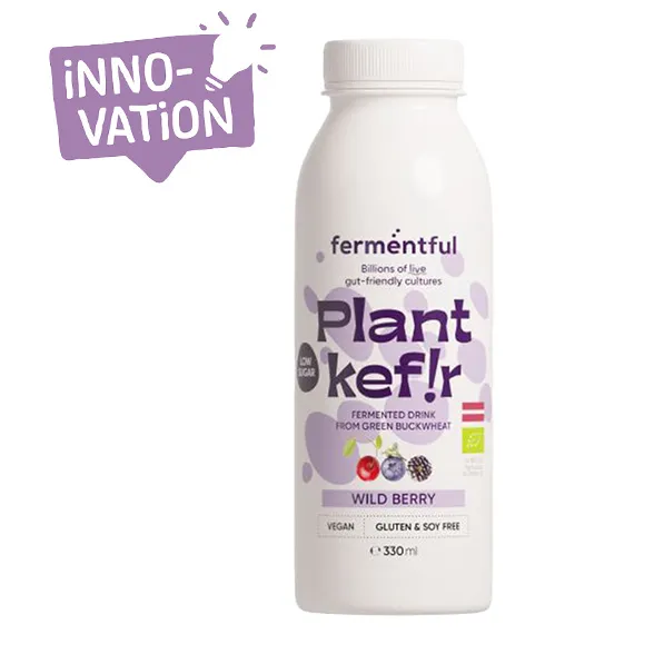 Fermentful ist vom klassische Kefir inspiriert, rein pflanzlich, cremig und voll probiotischer Power. Hergestellt aus 100 % biologischen Pflanzenzutaten, ganz ohne Soja, Gluten oder künstliche Zusätze – und mit niedrigem Zuckergehalt. Zu kaufen gibt es den Drink in den Sorten Chocolate oder Berry.