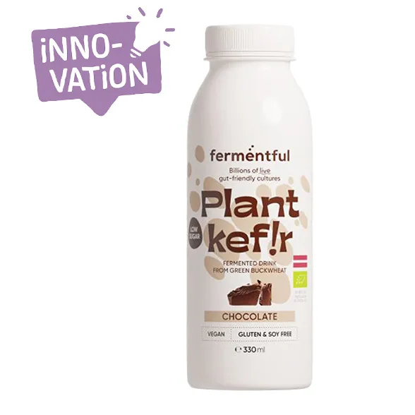 Fermentful ist vom klassische Kefir inspiriert, rein pflanzlich, cremig und voll probiotischer Power. Hergestellt aus 100 % biologischen Pflanzenzutaten, ganz ohne Soja, Gluten oder künstliche Zusätze – und mit niedrigem Zuckergehalt. Zu kaufen gibt es den Drink in den Sorten Chocolate oder Berry.